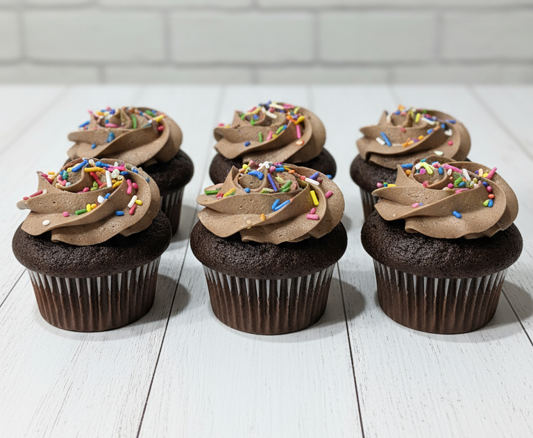 Indulge in our signature chocolate cupcakes, crafted with premium cocoa and a light, airy chocolate buttercream that melts on your palate. Each cupcake is topped with vibrant rainbow sprinkles for a festive touch. Completely nut-free, these treats are perfect for those with allergies or sensitivities.