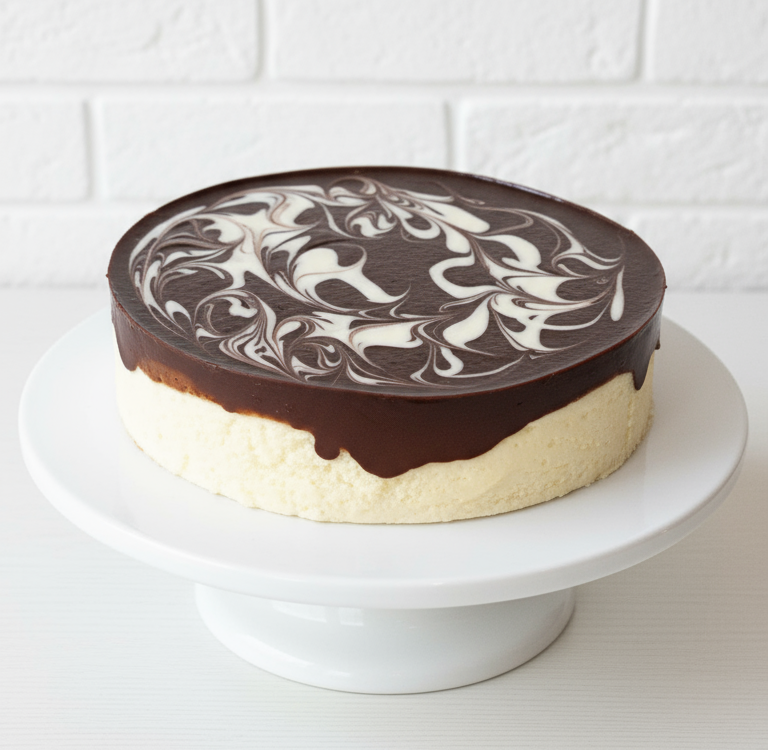 Our Chocolate Ganache Cheesecake is rich, creamy, and utterly decadent. A smooth cheesecake base is topped with a luscious layer of chocolate ganache and finished with an elegant white chocolate marble design. 100% nut-free, kosher-certified, and sesame-free — a show-stopping dessert for any celebration or indulgent moment.
