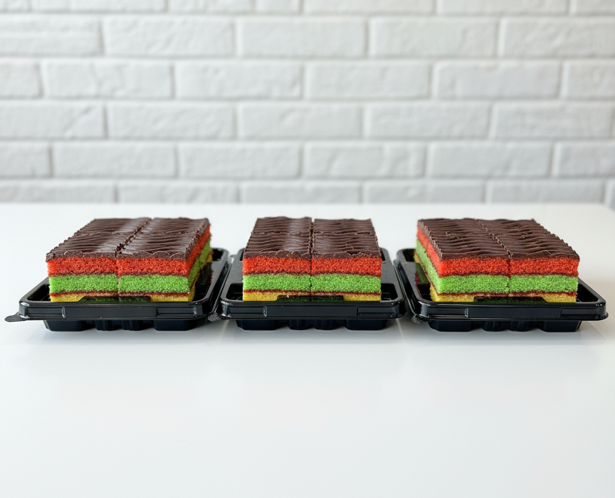 Our Italian Rainbow Cookie Pack brings you six slices of the beloved bakery classic — made completely nut-free. Layers of vibrant red, yellow, and green sponge cake are stacked with sweet raspberry jam and coated in a smooth chocolate shell. We use apricot kernels in place of almond to replicate the authentic taste of a traditional Italian rainbow cookie. 100% nut-free, kosher-certified, and sesame-free — a perfect gift or party treat.